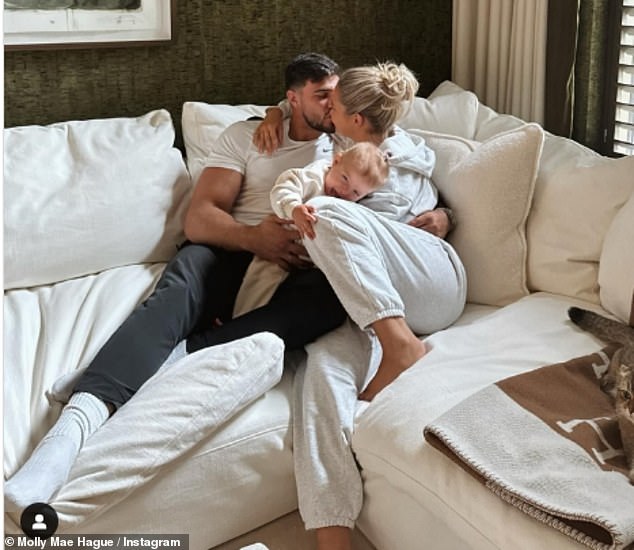 في الصورة، تظهر مولي ماي وهي تقبل تومي بينما تحتضن ابنتهما بامبي البالغة من العمر 16 شهرًا بينهما.