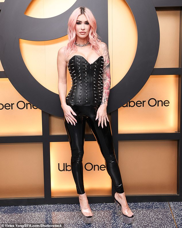 عرضت ميغان فوكس منحنياتها في مشد جلدي مناسب مع خط عنق عميق ومسامير فضية أثناء مشاركتها في لاس فيغاس قبل مباراة Super Bowl LVIII يوم الأحد. قامت بإقران الجزء العلوي الشائك مع زوج من طماق الفينيل السوداء الملائمة للشكل وحذاء مفتوح الكعب العالي مفتوح الأصابع
