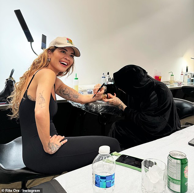 انتقلت ريتا إلى Instagram يوم الجمعة وشاركت صورًا للحظة التي أضافتها إلى مجموعتها الواسعة من الوشم مع مصمم سهم على ساعدها.