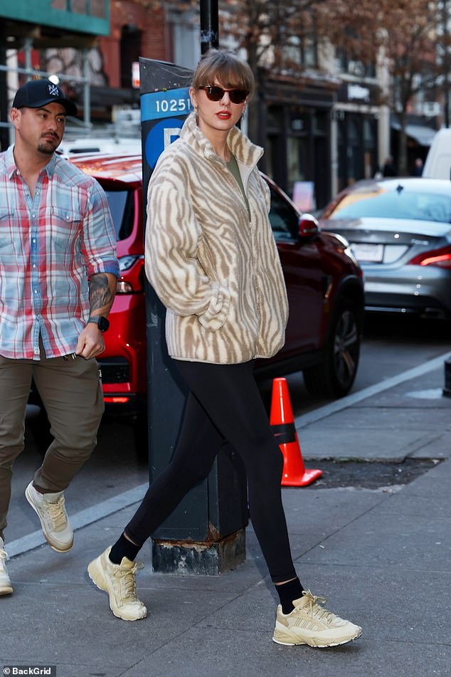 وفي الوقت الذي أثارت فيه تكهنات المعجبين بأنها تعمل على إعادة تسجيل ألبومها المحبوب، Reputation، مع رحلات متعددة إلى Electric Lady Studios هذا الأسبوع، ظهرت نجمة البوب، البالغة من العمر 34 عامًا، بشكل أنيق في صوف مطبوع عليه حمار وحشي باللونين الأبيض والبيج وطماق سوداء. .