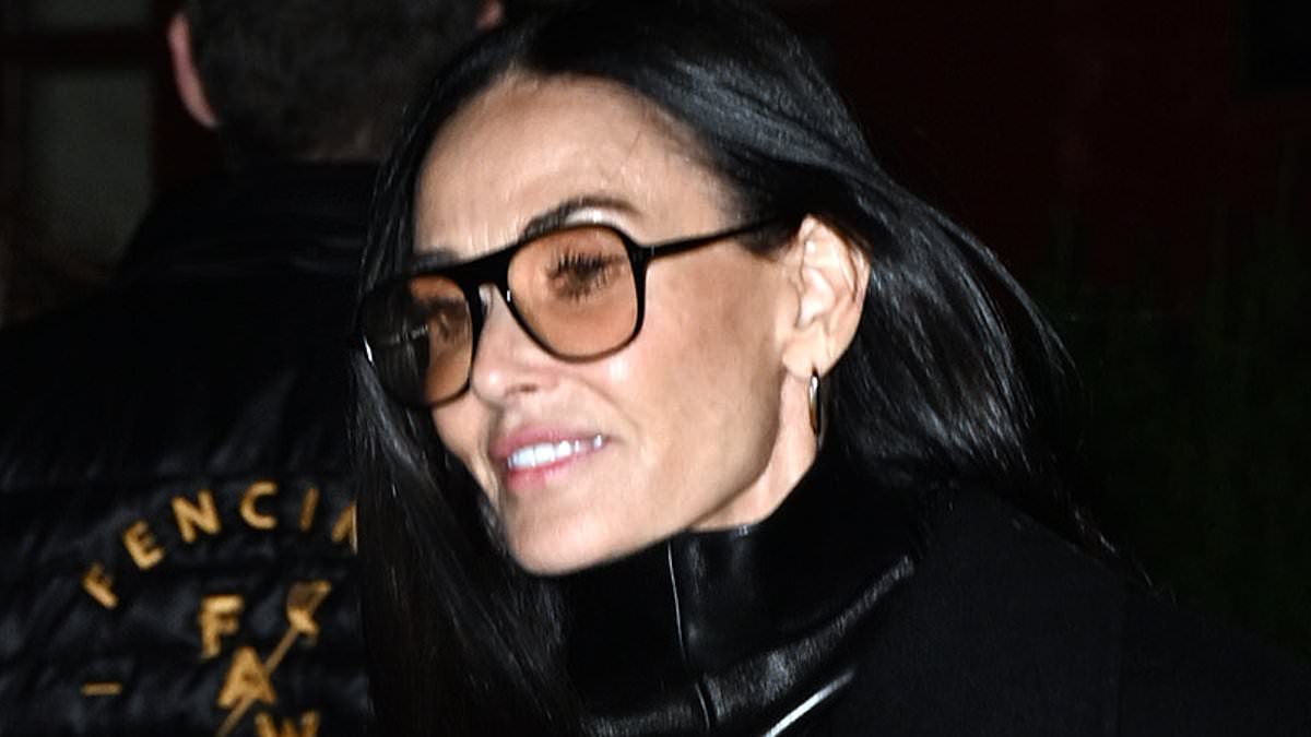 بدا مور أنيقًا لهذا الحدث بزي أسود بالكامل شمل معطفًا أسود. بلوزة جلدية بياقة مدورة وسراويل ضيقة.