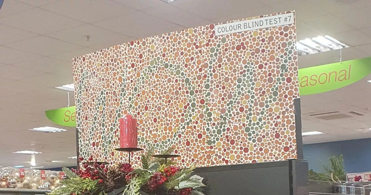 بينما كان عملاء Home Bargains يتصفحون الممرات، لاحظ العديد منهم أنهم عثروا على اختبار عمى الألوان الذي تم عرضه في المتجر. انتقل أحد المتسوقين إلى موقع Reddit لمشاركة لقطة من اللافتة الضخمة المعلقة فوق الممر النهائي، والمكونة من نقاط برتقالية وحمراء وزرقاء.
