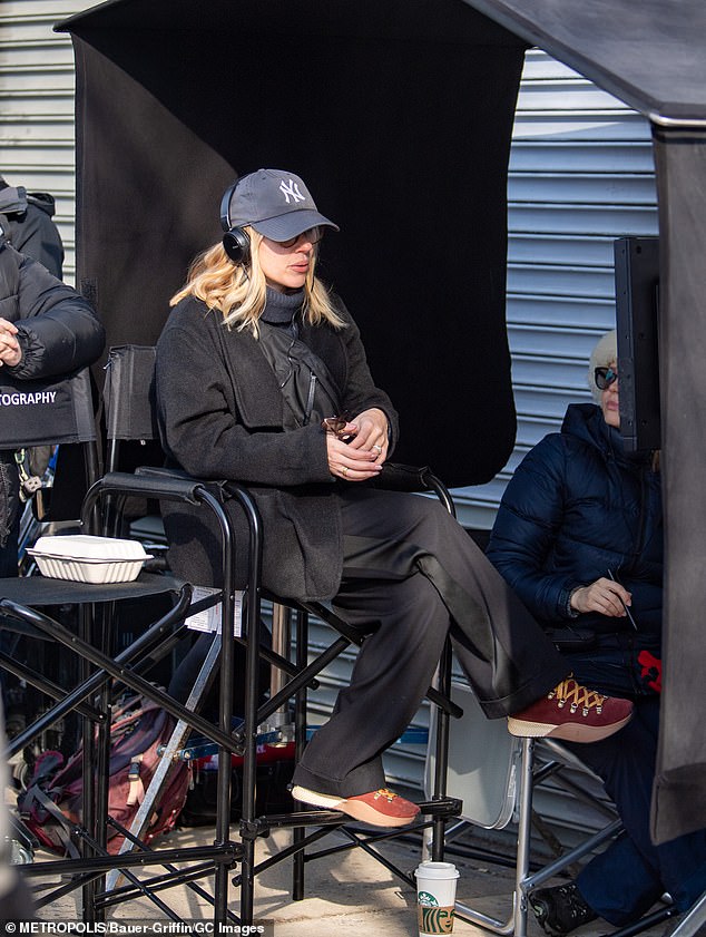 شوهدت جون سكويب، المرشحة لجائزة الأوسكار، وهي تصل إلى موقع التصوير مرتدية سترة أرجوانية طويلة وقميصًا متطابقًا وزوجًا من الأحذية الرياضية الزرقاء.