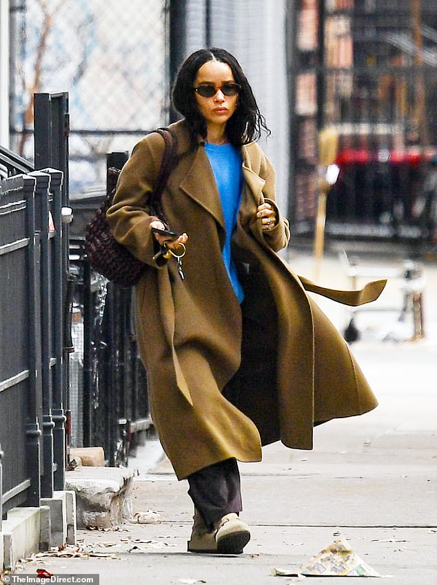 ارتدت زوي – التي تعتمد على المصمم أندرو موكمال – معطفًا بنيًا أنيقًا فوق سترة زرقاء، وسروالًا بني داكن واسع الساق، وقباقيب “Boston Soft Footbed” بقيمة 205 دولارات من بيركنستوك.