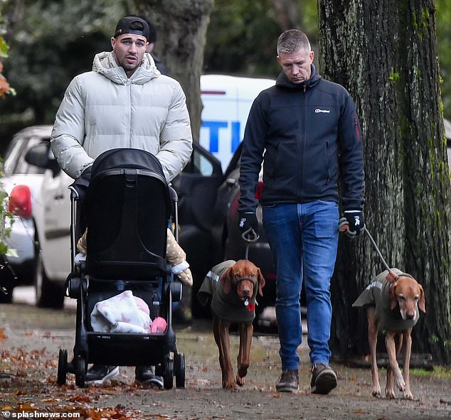 استمتع الملاكم بالمشي مع ستيفن وكلبيه وطفلته الصغيرة التي كانت تجلس في عربة الأطفال بعد عودته من استراحة سكران في الشرق الأوسط.