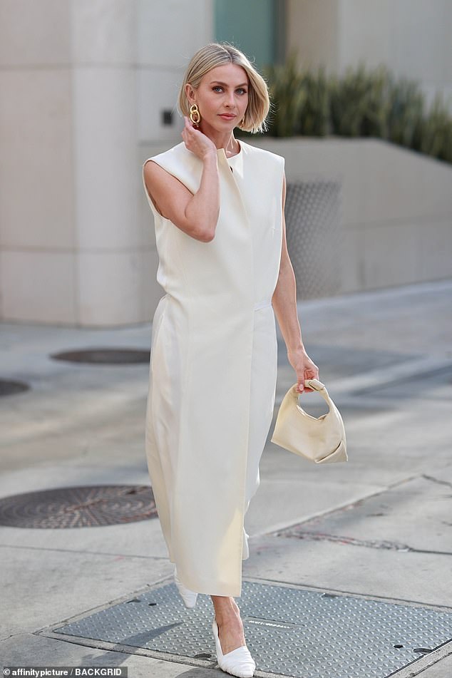جوليان هيوغ تبهر الجميع بفستانها الأبيض الأنيق وحقيبة يدها الكريمية أثناء الترويج لاستوديو الرقص الخاص بها وكتابها القادم