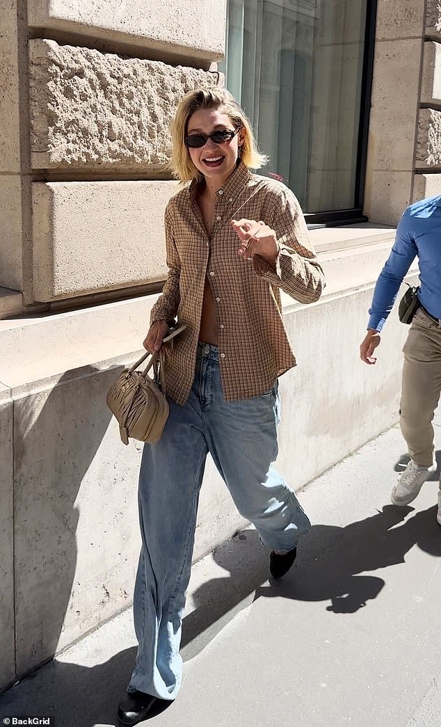 ظهرت العارضة الأمريكية، البالغة من العمر 29 عامًا، بمظهر أنيق نموذجي مرتدية قميصًا منقوشًا ذو ألوان محايدة، ارتدته مفكوكة الأزرار لإظهار وسطها