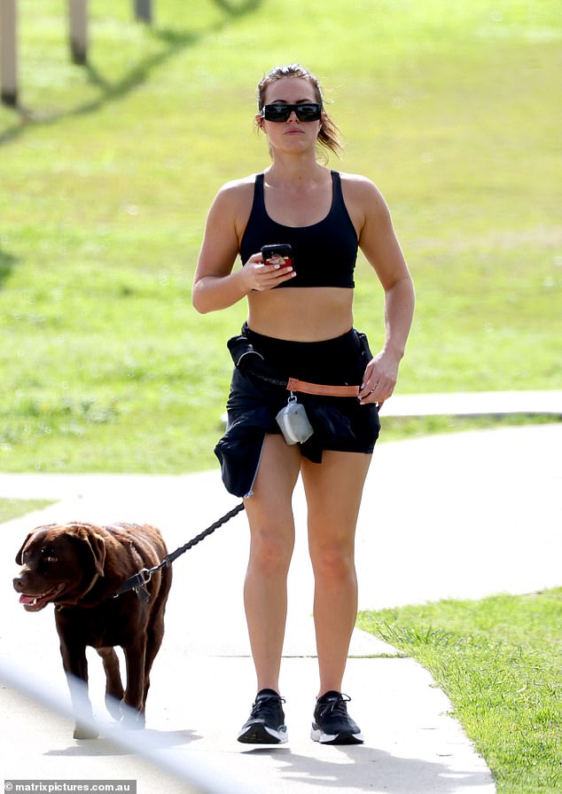 أظهرت الممثلة البالغة من العمر 32 عامًا قوامها مرتدية قميصًا قصيرًا أسود وشورتًا قصيرًا أثناء نزهة على كلبها في ماروبرا.