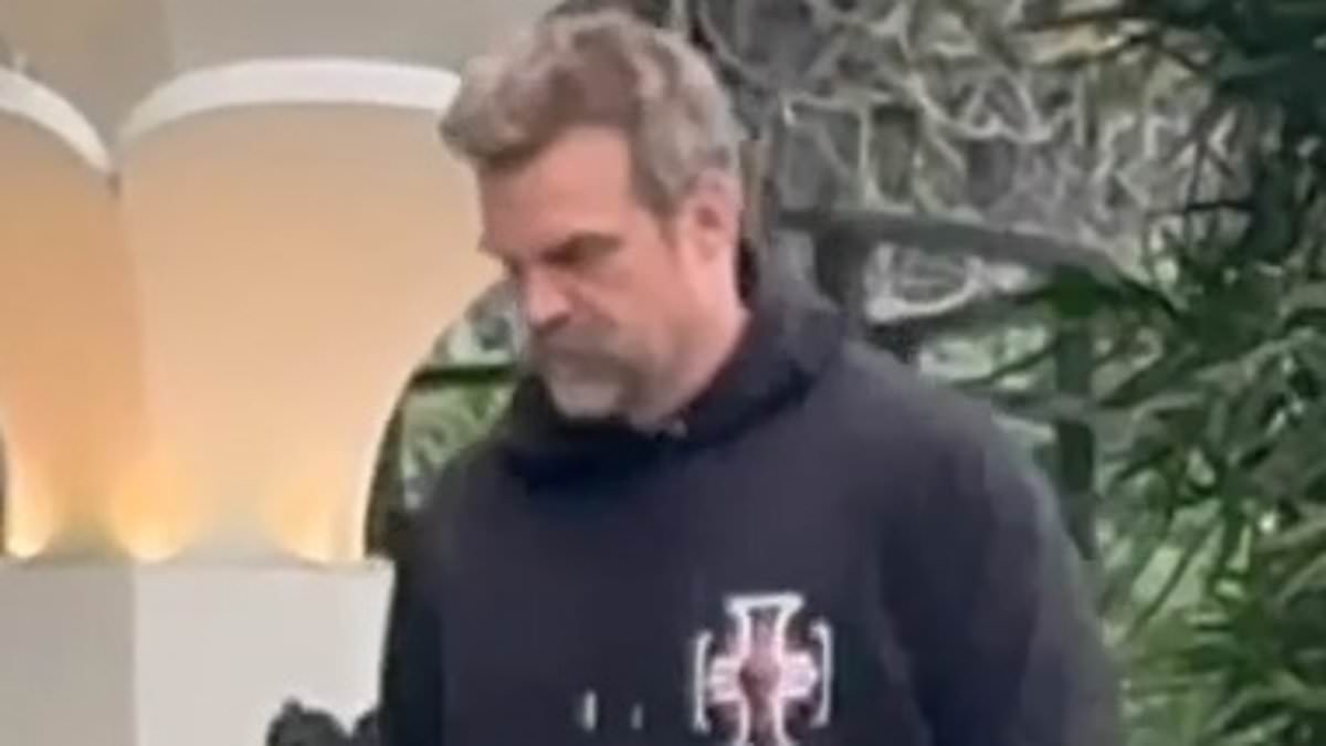 ديفيد هاربور حافي القدمين أثناء سيره خارج فندق فخم قبل الخروج الغامض من العرض الأول لفيلم Stranger Things