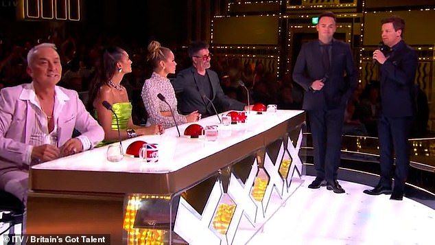 كان الثنائي المضيف Ant وDec، وكلاهما يبلغ من العمر 48 عامًا، يقدمان للتو المتسابق التالي – الساحر Trixy أثناء وقوفهما بجوار لجنة التحكيم.