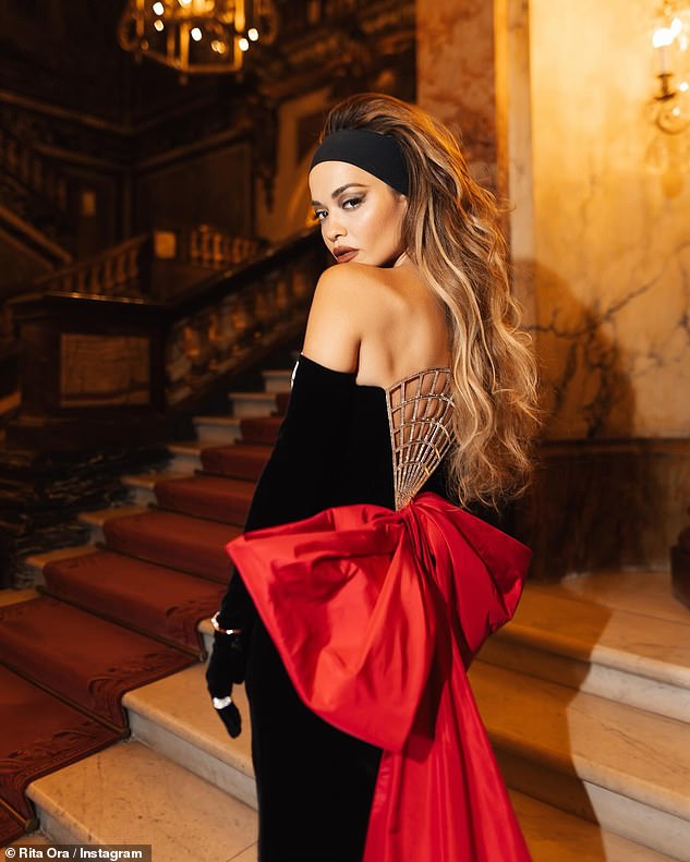 ولإكمال إطلالتها الأنيقة، تم دفع شعر ريتا للخلف عن وجهها بعصابة رأس سوداء وتصفيفه على شكل تجعيدات كثيفة.