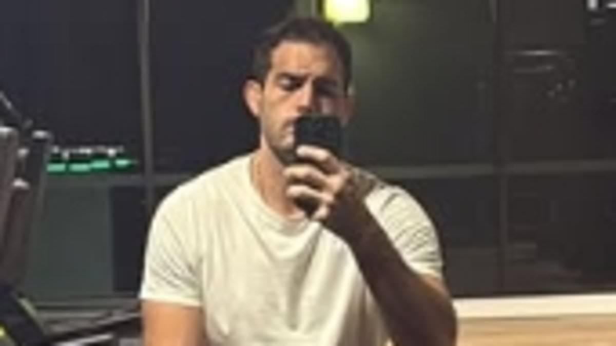 أثناء التقاط صورة سيلفي في المرآة، شوهد وهو يمارس التمارين الرياضية وهو يرتدي قميصًا أبيض غير رسمي، مع شورت قصير منقوش.