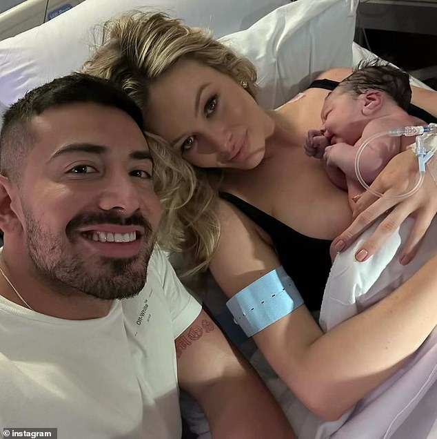 استقبلت سيمون هولتزناجل (يمين) طفلها الأول مع صديقها المدرب الشخصي جونو كاستانو (يسار)
