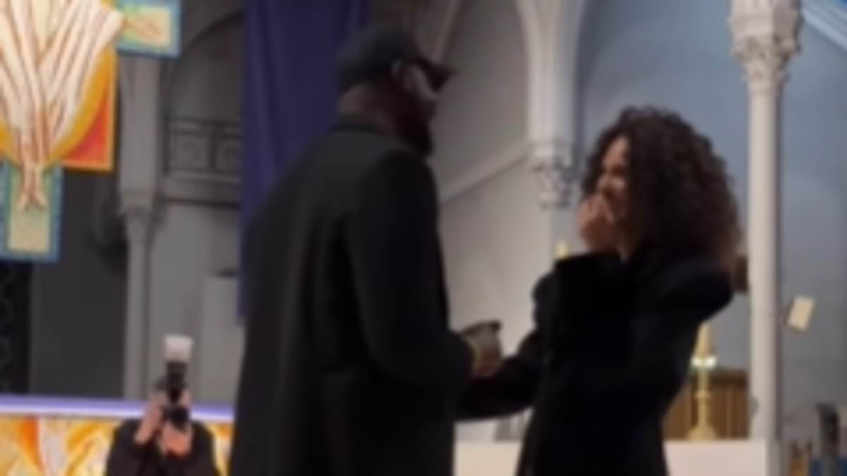 وركع عاشق سيندي، الذي لم تذكر اسمه، على ركبة واحدة في الكنيسة وقدم للعارضة خاتمًا، قبل أن يقف ويحتضنها.