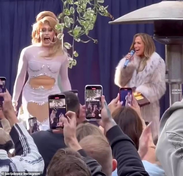 وصعدت الممثلة البالغة من العمر 54 عاماً، على خشبة المسرح حيث كان يقف المقلد ليصدمها صدمة حياتها. بينما كانت جينيفر ترتدي معطفًا من الفرو يصل طوله إلى الأرض وشعرها منسدلًا، كانت ملكة السحب ترتدي نفس الفستان المقطوع الذي ارتدته جيه لو في أحدث فيديو موسيقي لها لأغنيتها المنفردة الجديدة Can’t Get Enough
