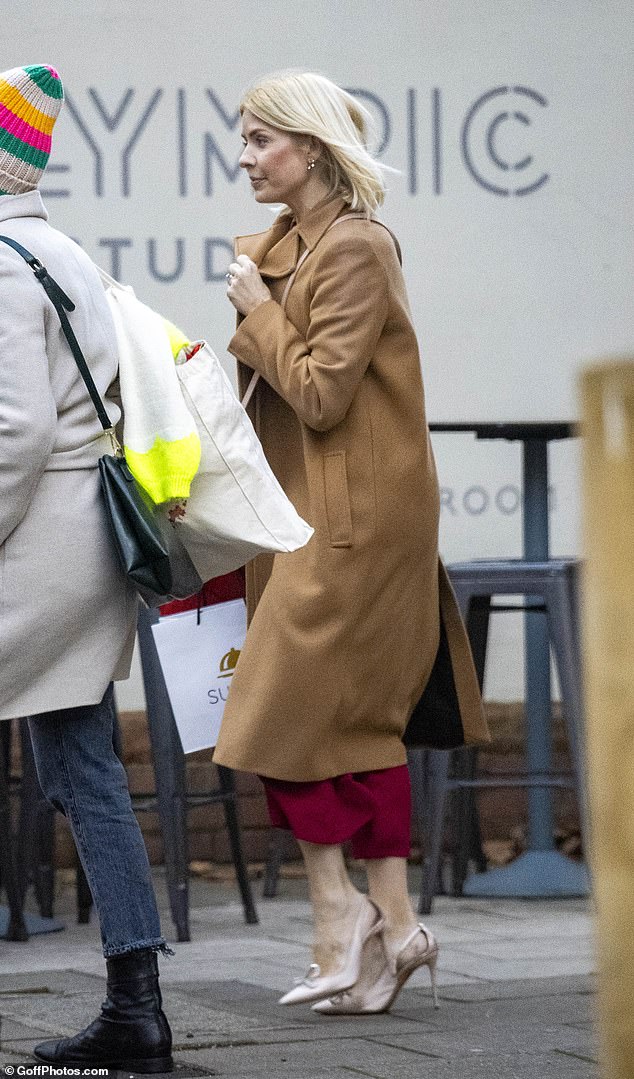 وشوهدت هولي (42 عاما) وهي ترتدي معطفا من الجمل وبذلة حمراء وحذاء بكعب ذهبي، وهي تغادر المطعم القريب من منزلها في جنوب غرب لندن حيث تناولت العشاء مع والدتها ليندا وزوجها دان بالدوين ومجموعة من الأصدقاء.