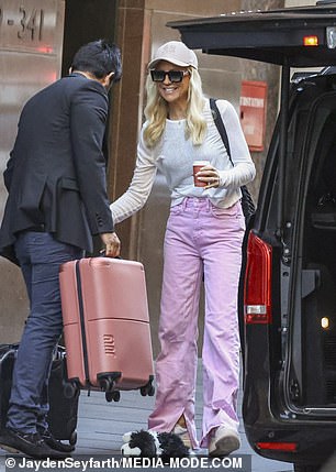 بعد أن قدمت تحية ودية للسائق، قامت بتسليم حقيبة ابنتها الوردية الزاهية ديزي داك وميني ماوس قبل ركوبها إلى السيارة.