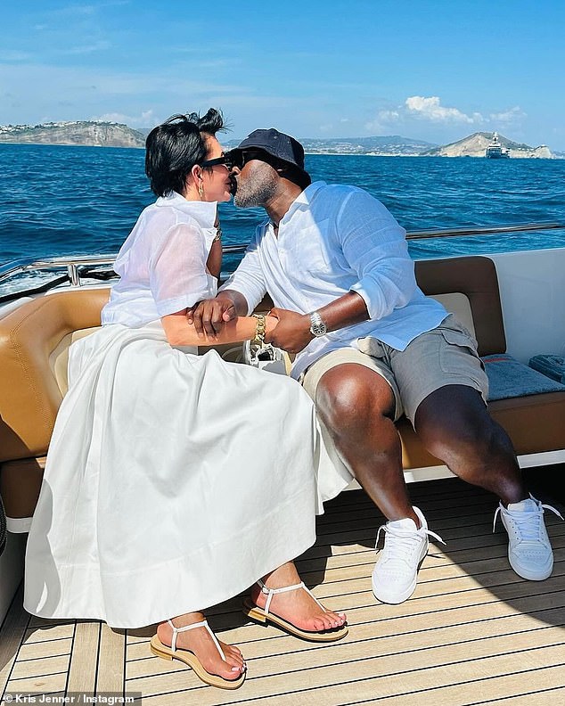 تبادل الزوجان قبلة أثناء الاستمتاع برحلة على متن يخت والتنسيق في ملابس بيضاء خلال عطلة في وقت سابق من هذا العام.