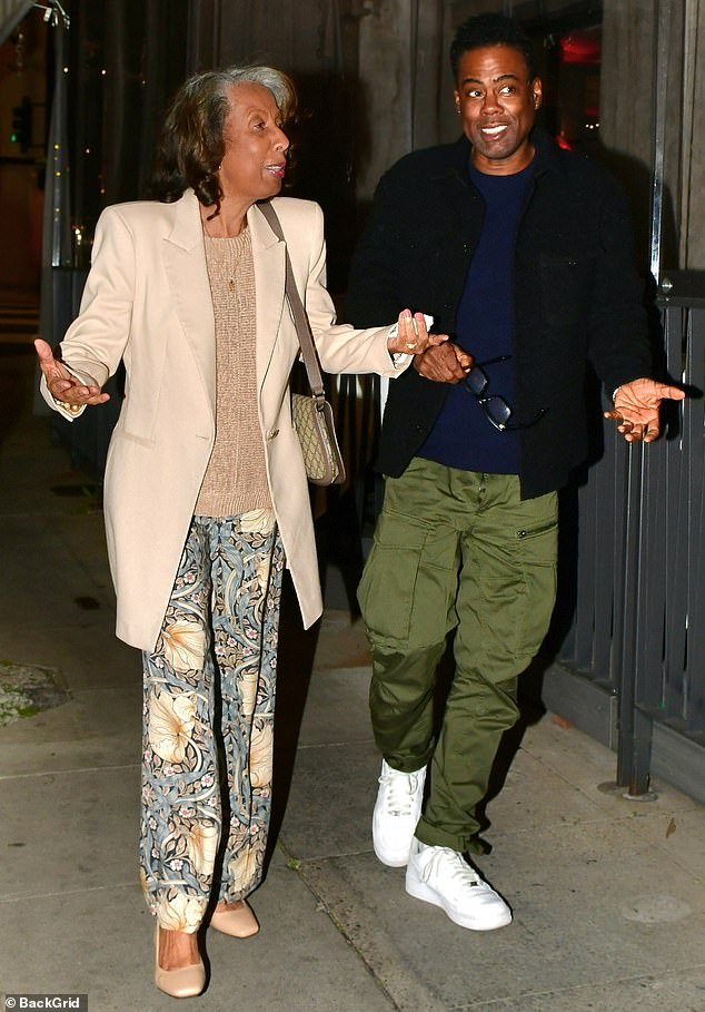تألق كريس روك بإطلالة غير رسمية عندما اصطحب والدته روزالي لتناول العشاء في مطعم Crustacean في بيفرلي هيلز مساء الجمعة.