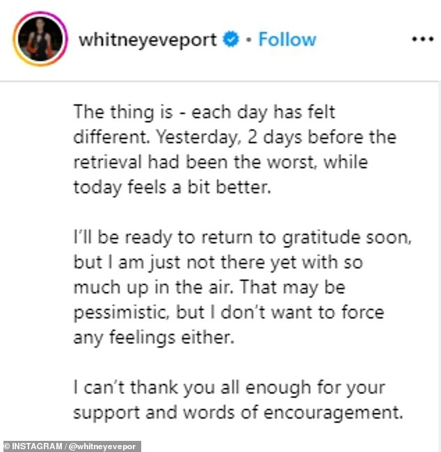 “أثناء عملية سحب البويضات، أردت أن أشارككم تحديثًا صادقًا حول ما أشعر به، وبصراحة، أشعر بالسوء. الأمر لا يتعلق بعدم الراحة الجسدية (وهو أمر مزعج للغاية – الانتفاخ والكدمات والتورم والثقل) ولكن بعدم الراحة العاطفية”، كتبت في التعليق.