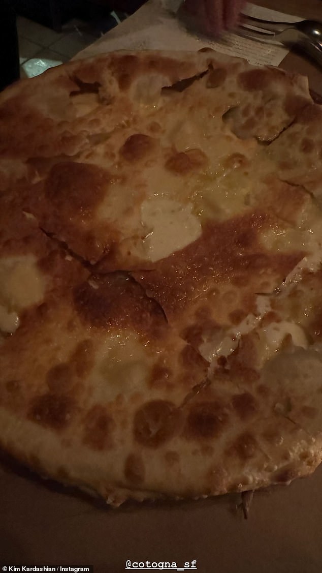 وشاركت كيم اسم المطعم – Cotogna – في قصصها، وشرعت في نشر صورة ومقاطع فيديو لخبز الجبن المسمى Focaccia di Recco.