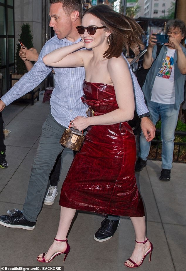 بدت الممثلة البالغة من العمر 35 عامًا مذهلة في الفستان الداكن الذي انتهى أسفل ركبتيها مباشرةً، ويتميز بحزام بإبزيم على شكل قلب ملفت للنظر.