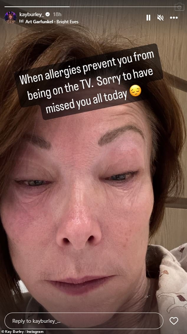 ولم يكن من الممكن التعرف على المذيعة، البالغة من العمر 62 عامًا، في صورة تمت مشاركتها على موقع إنستغرام، تظهر وجهها المتورم بشدة إلى جانب التعليق التالي: “عندما تمنعك الحساسية من الظهور على شاشة التلفزيون”. آسف لأنني افتقدتكم جميعًا اليوم.