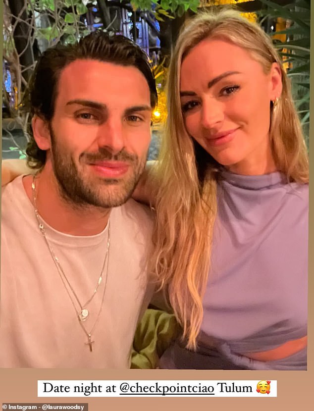 لورا وودز، 36 عامًا، تقدم عرضًا محبوبًا مع صديقها آدم كولارد، 28 عامًا، حيث يستمتعان بموعد عشاء في إجازتهما الرومانسية إلى المكسيك.