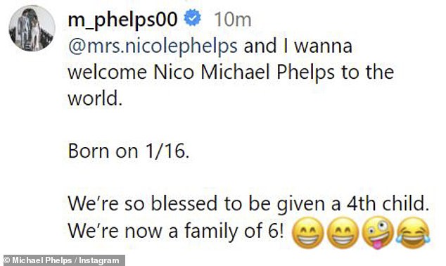 وكتب في التعليق أن الطفل الصغير ولد يوم الثلاثاء الماضي: “@mrs.nicolephhelps وأريد أن أرحب بنيكو مايكل فيلبس في العالم”. ولدت في 16/1.