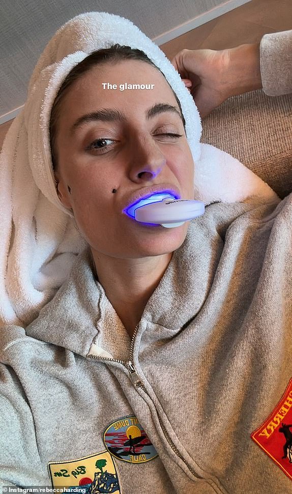 شاركت صورة لها وهي تستخدم جهاز تبييض الأسنان LED أثناء استلقائها على سرير الفندق، مرتدية قميص رياضي غير رسمي ومنشفة على رأسها.