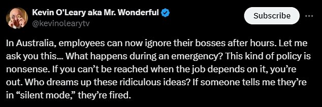 انتقد كيفن أوريلي، المليونير في برنامج Shark Tank، قانون الحق في قطع الاتصال الجديد في أستراليا ووصفه بأنه “غبي للغاية”، وتساءل من الذي قد يخطر بباله مثل هذه “الفكرة الغبية”