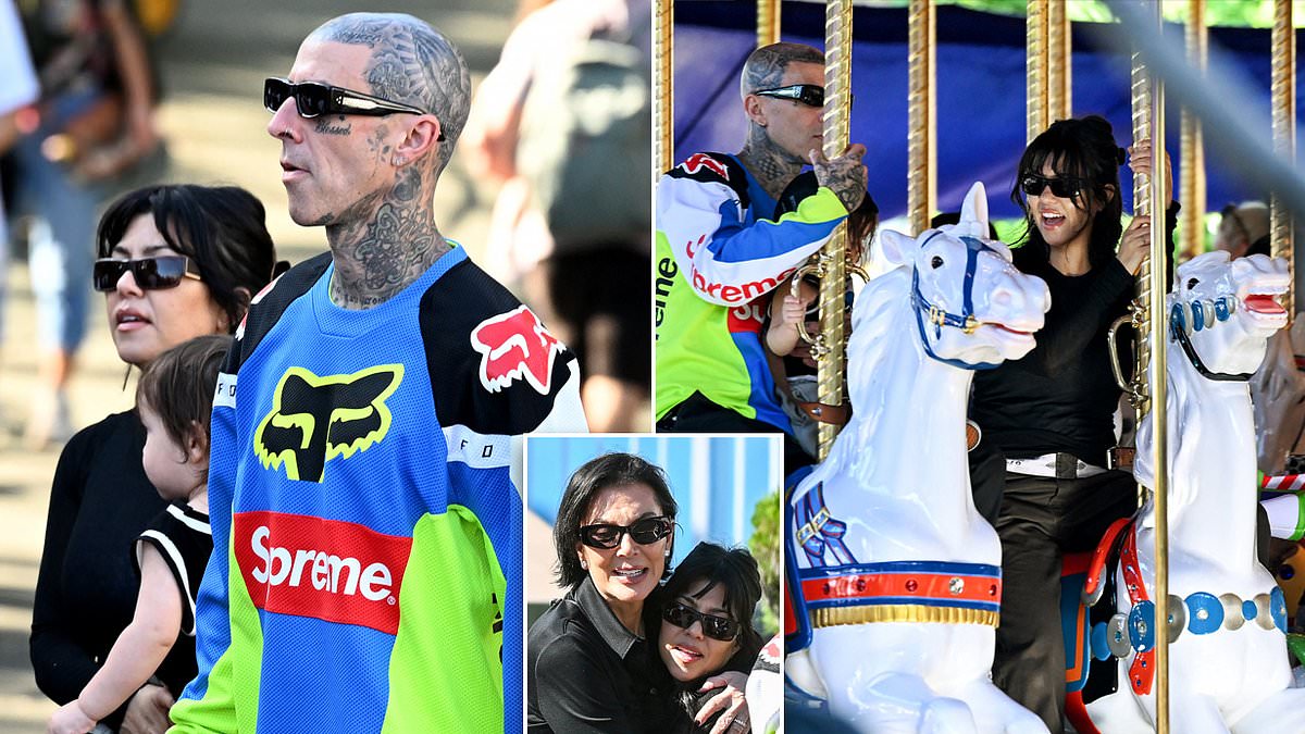 ابتهج كورتني كارداشيان ببهجة أثناء ركوبه للملك آرثر كاروسيل إلى جانب جارتها التي تحولت إلى زوجها ترافيس باركر وابنهما روكي الثالث عشر في ديزني لاند بارك في أنهايم ، كاليفورنيا يوم الاثنين.