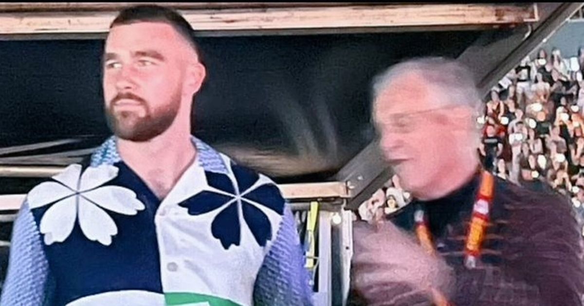 جلس نجم اتحاد كرة القدم الأميركي ترافيس في خيمة كبار الشخصيات إلى جانب والد تايلور، سكوت سويفت، وشوهد وهو يحمل اللافتة إلى جانب زملائه Swifties. أثناء حمل اللافتة واصل الرقص كما فعل خلال معظم العرض. كان يرتدي قميصًا منقوشًا باللون الأخضر والأبيض والأزرق بينما كان يقضي الليل يبتسم ويغني ويدعم صديقته الجديدة.