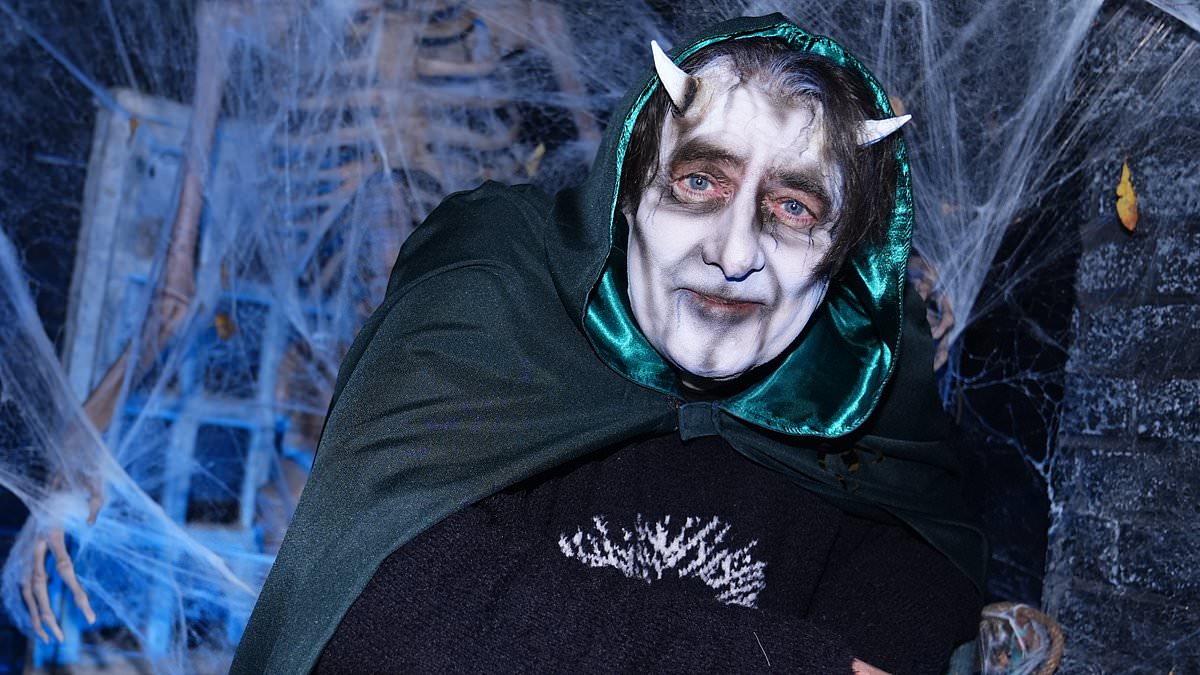 ارتدى نجم التلفزيون، البالغ من العمر 64 عامًا، قرونًا بيضاء ورسم وجهه لاحتفالات 31 أكتوبر بينما كان يلتف في عباءة خضراء داكنة.