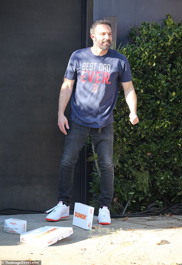 كان يرتدي قميصًا مشابهًا كان يرتديه عندما ضبطه المصورون وهو يسكب صناديق Dunkin خارج منزله في لوس أنجلوس في أواخر ديسمبر 2020.