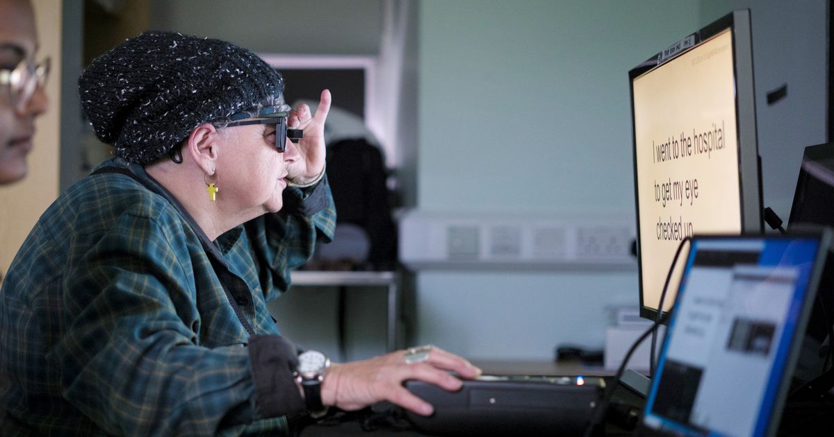 ولرؤية الكلمات والكتابة، يرتدي المرضى نظارات الواقع الافتراضي التي تحتوي على كاميرا فيديو. ويتم توصيل هذا بجهاز كمبيوتر صغير متصل بحزام الخصر، والذي يتضمن ميزة التكبير/التصغير لتكبير النص.
