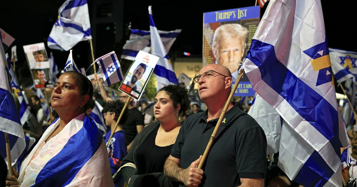 وحمل البعض أعلام إسرائيل مع شريط أصفر للرهائن، بينما رفع آخرون ملصقات عالية عليها وجوه الرهائن.