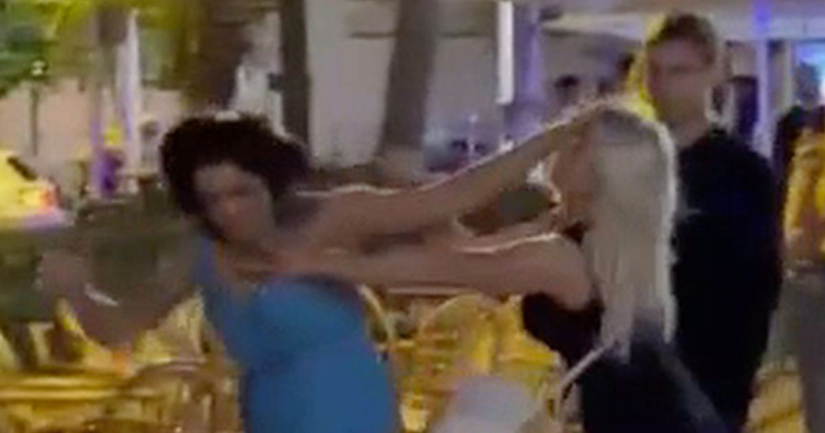 شوهدت امرأتان بريطانيتان بدأتا القتال في منتجع سياحي في مايوركا تنقلبان على رجل تدخل للمساعدة.