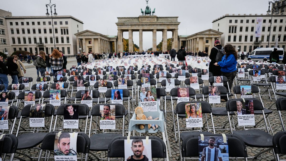في بوابة براندنبورغ في برلين يوم الثلاثاء ، تمت قراءة أسماء الضحايا الإسرائيليين في ذلك اليوم في حفل.