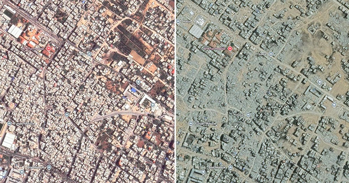 تُظهر الصور الفضائية الرهيبة في غزة الدمار الحقيقي بعد غارات جوية إسرائيل التي لا هوادة فيها ، حيث مات أكثر من 1000 شخص يتضورون جوعا أثناء محاولتهم الحصول على مساعدة طعام