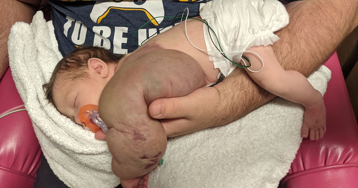 طفل صغير يولد بكيس بحجم حبة الأناناس تحت ذراعه ثقيل جدًا لدرجة أنه يؤدي إلى تقوس عموده الفقري