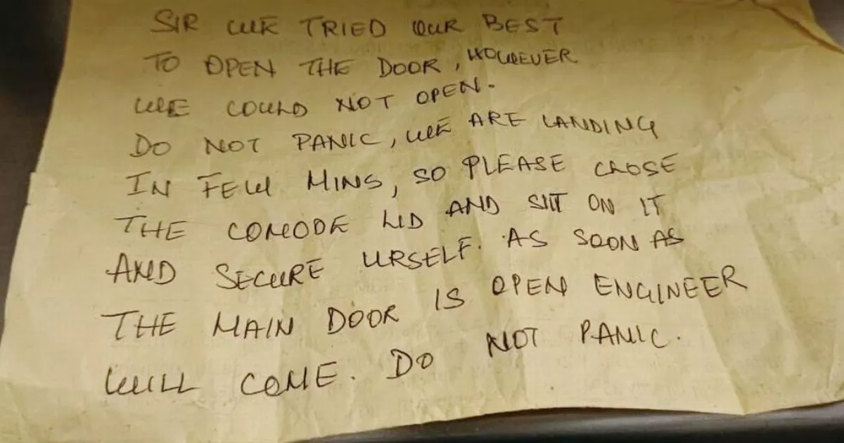 وحاولت المضيفات الدخول من الخارج، لكن جهودهن باءت بالفشل. ثم كتب أحد أفراد الطاقم ملاحظة على قطعة من الورق ومررها عبر فجوة في الباب. وجاء في الرسالة: “سيدي، لقد بذلنا قصارى جهدنا لفتح الباب، لكننا لم نتمكن من فتحه. لا داعي للذعر، سنهبط خلال دقائق قليلة، لذا يرجى إغلاق غطاء المرحاض والجلوس عليه، وتأمين نفسك. بمجرد أن يُفتح الباب الرئيسي، سيأتي مهندس. لا تُصب بالذعر.”