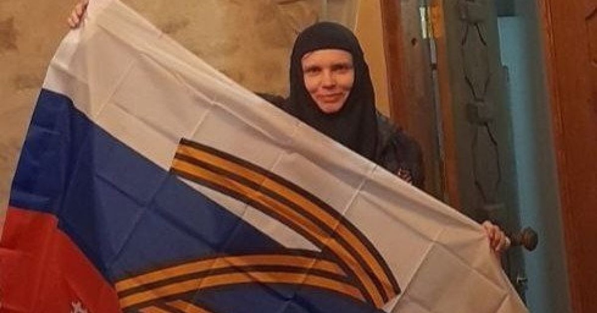 تظهر الصور المروعة راهبة في عاداتها وهي ترفع العلم الروسي الذي يزينه شعار “Z” – وهو رمز يستخدم لإظهار الدعم للغزو المميت لأوكرانيا.