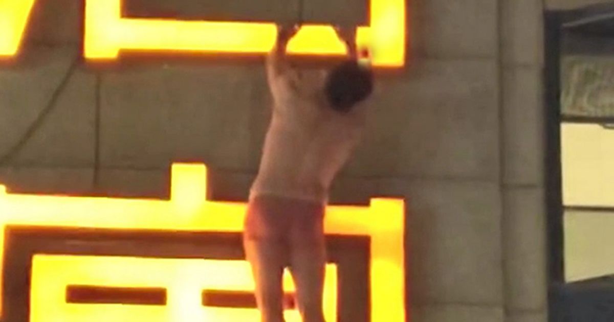 التقطت لقطات مؤثرة لحظة تعليق عاشق سري مزعوم من لافتة على جانب أحد الفنادق وهو يرتدي ملابس داخلية فقط لتجنب القبض عليه.