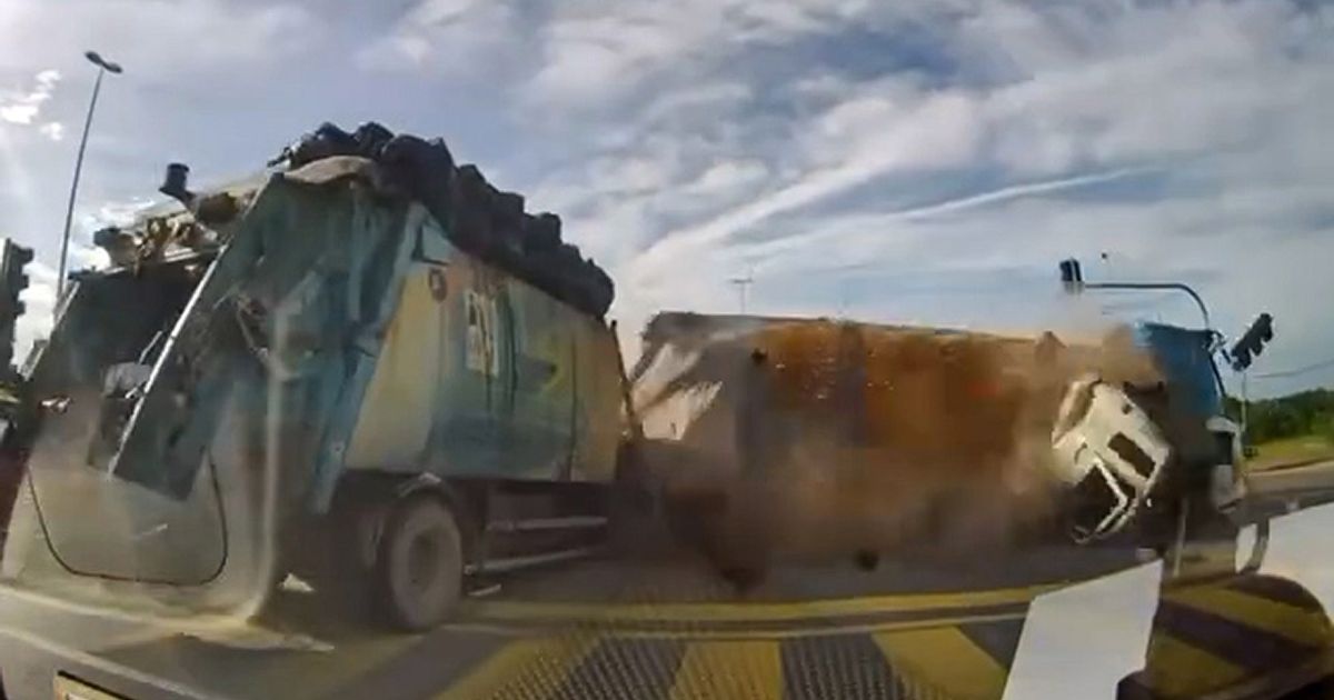 وبعد لحظات، شوهدت الشاحنة القلابة قادمة من اليسار بسرعة عالية قبل أن تصطدم بالمركبات. أدى الاصطدام إلى تمزيق قسم المقصورة الأمامية لشاحنة القمامة وتناثر الطين والحطام عبر الطريق.