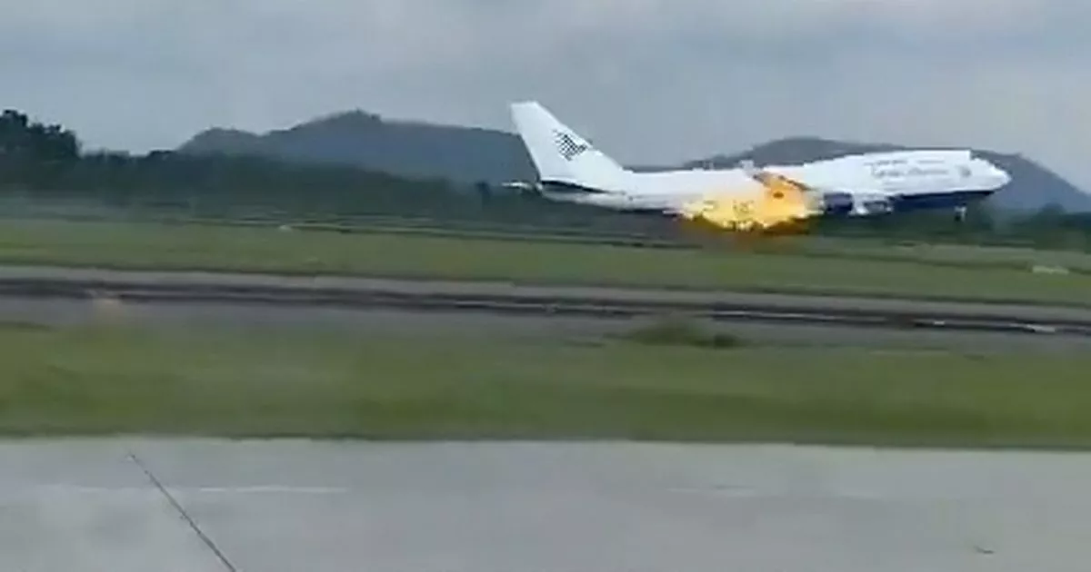 انطلقت سلسلة من النيران البرتقالية من محرك طائرة بوينج 747-400، التي اضطرت إلى الهبوط اضطراريا في مطار السلطان حسن الدين الدولي في إندونيسيا.