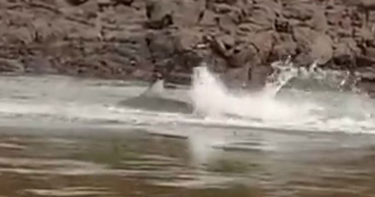 أظهرت لقطات مروعة لحظة قيام سمكة قرش بأخذ قطعة من ساق رجل بينما كان يسبح في المياه الضحلة للنهر.