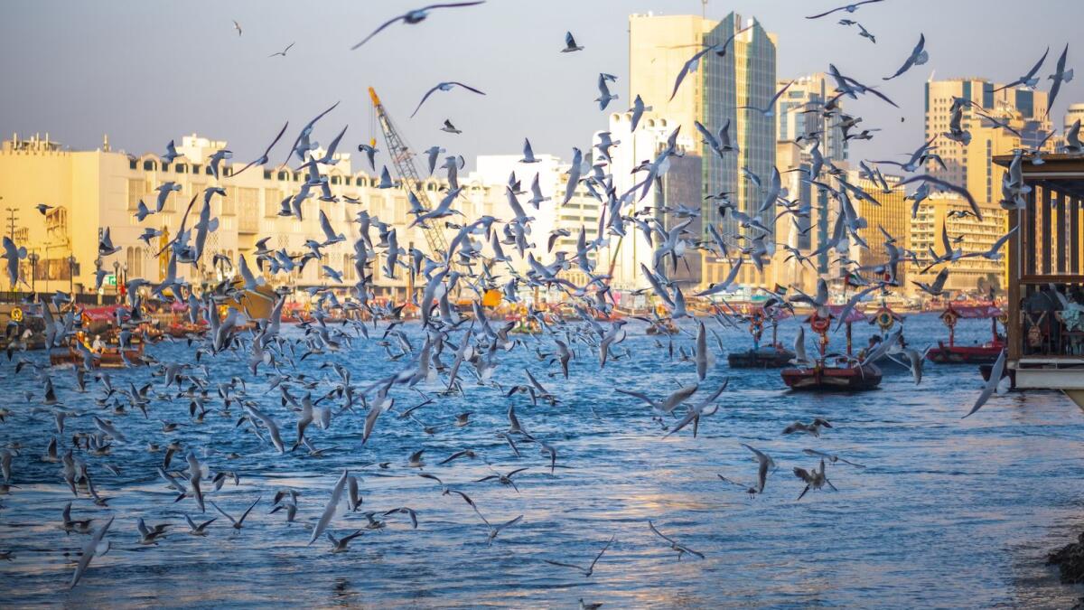 مع حلول فصل الشتاء في دولة الإمارات العربية المتحدة، تطير طيور النورس بأعداد كبيرة في خور دبي. 26 ديسمبر 2023. صورة KT: شهاب