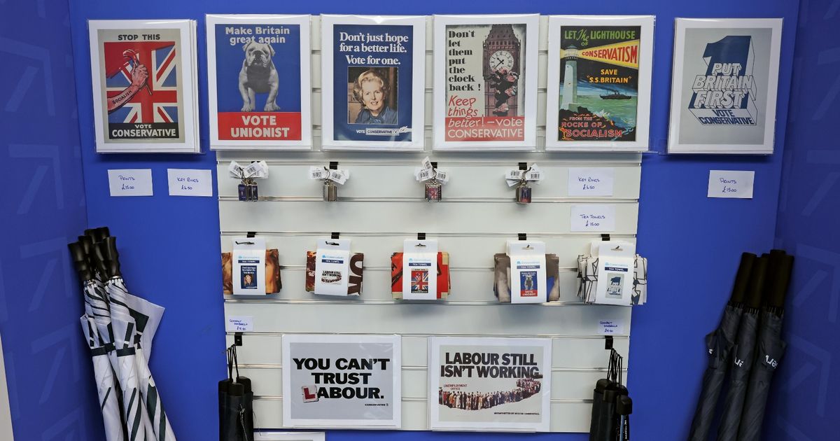 بينما تم تناثر صور حزب المحافظين السابقين مارغريت تاتشر ووينستون تشرشل حول المتجر ، لم يكن زعيم حزب المحافظين الحالي كيمي بادنوتش في أي مكان يمكن رؤيته