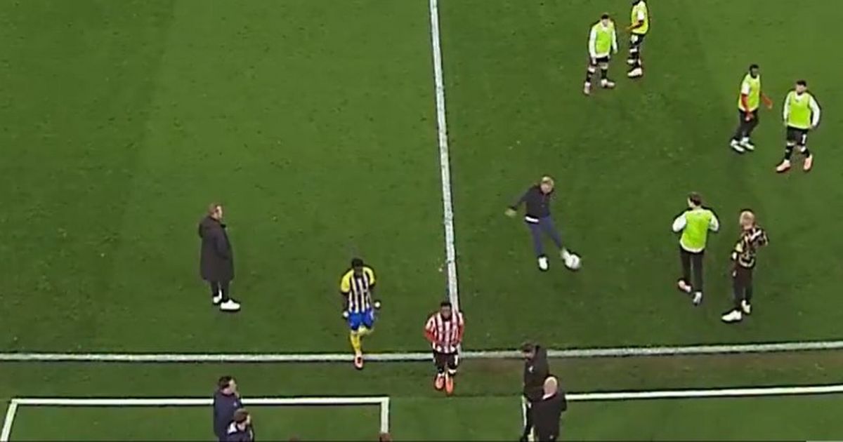 ثم يمكن رؤيته وهو يمزق الكرة قبل ضربها في المدرجات مع أربطةه. وضع يده على الفور للاعتذار للمؤيد الذي صدمته كرة القدم.
